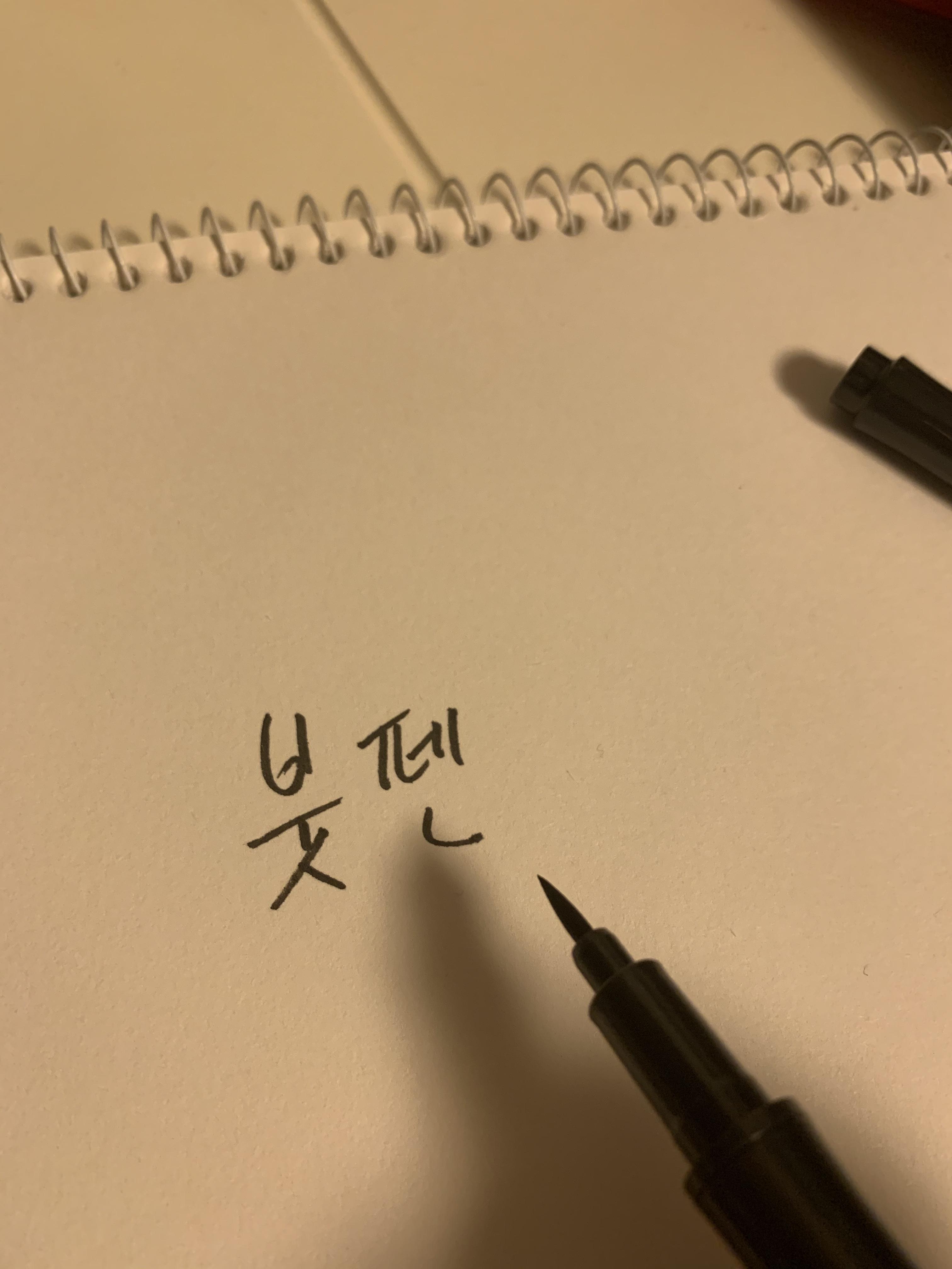 붓이 얇은 붓과 중간 붓이 달려있었다. 어제산 다이소 제온붓펜과 크게 다르지 않았다..